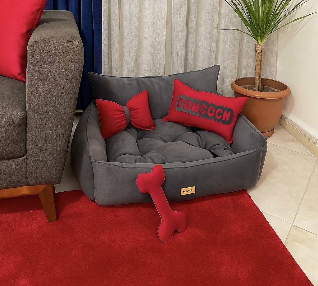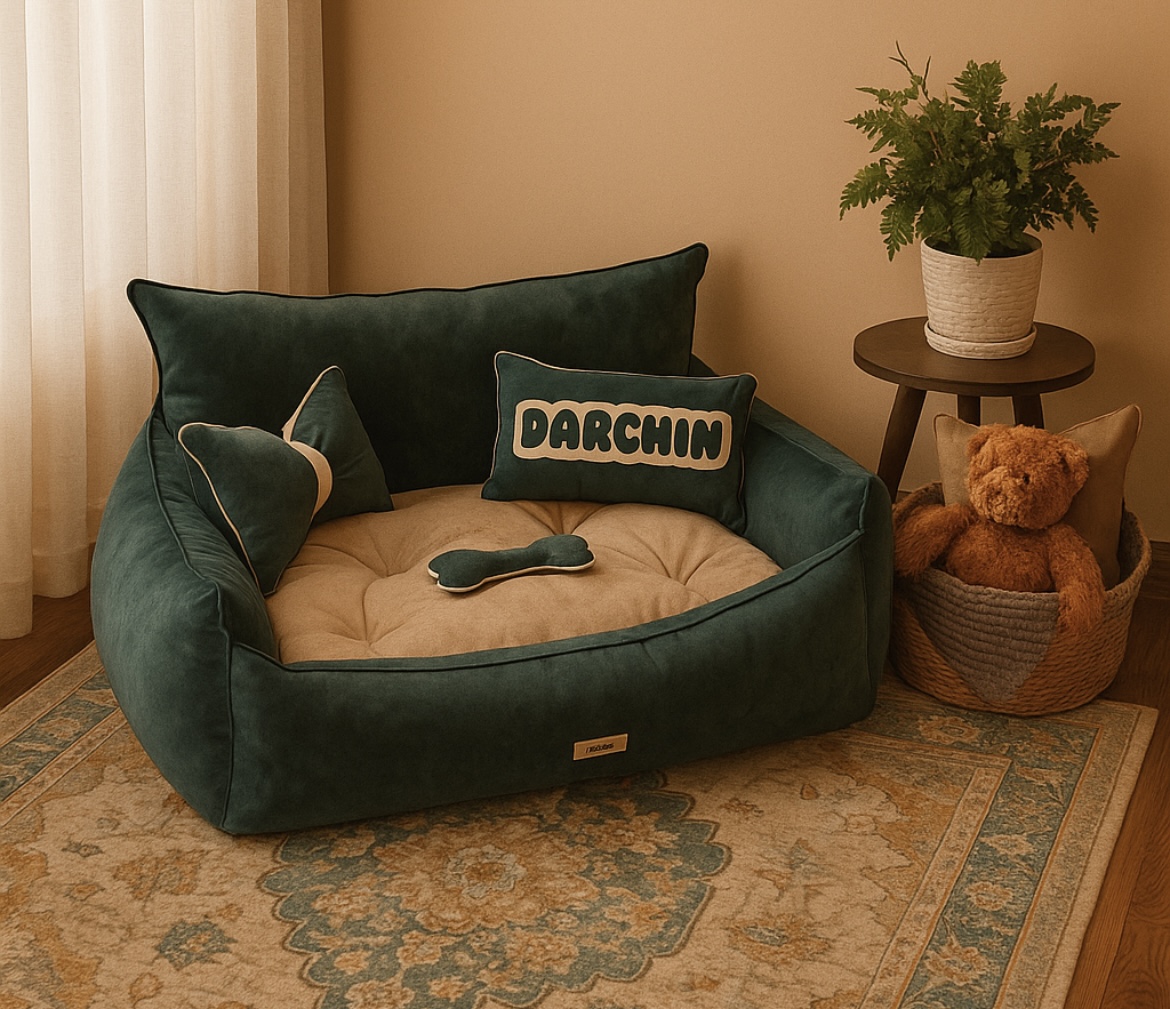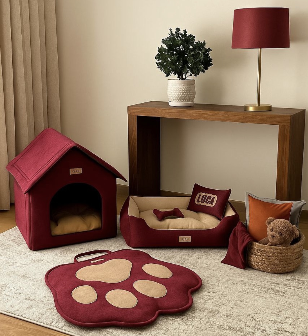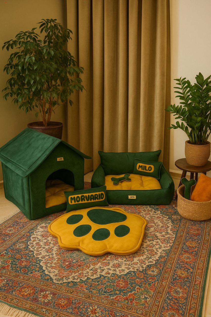 ست لاکچری پت شامل کلبه، جای خواب، مت پنجهای و کوسن